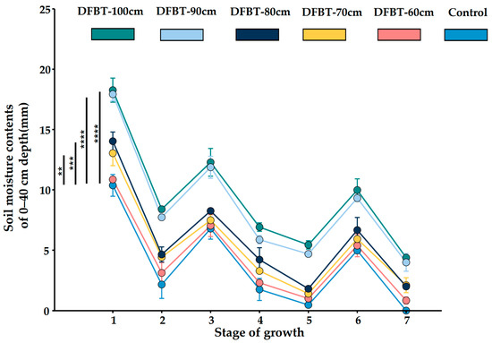 Soil moisture contents of 0–40 cm depth in different stages of spring wheat growth season. 1: From before sowing to sowing; 2: from sowing to emergence; 3: from emergence to tillering; 4: from tillering to stem elongation; 5: from stem elongation to heading; 6: from heading to milking; 7: from milking to maturity. The colors of different lines represent five DFBTs at different depths (60, 70, 80, 90, and 100 cm) and one control treatment (no DFBT). **, *** and **** represent p < 0.01, p < 0.001, and p < 0.0001, respectively.