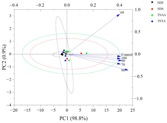 PCA of different DFBTs with NDF, NDS, TNAA, and TNTA. NDF, NDS, TNAA, and TNTA represent fertilizer nitrogen, soil nitrogen, total nitrogen absorption amount, and total nitrogen translocation amount, respectively. 60, 70, 80, 90, 100, and control represent five DFBTs at different depths (60, 70, 80, 90, and 100 cm) and a control treatment (no DFBT), respectively.