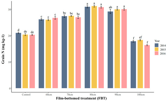 Absolute GY and GN were illustrated in Figure 3 and Figure 4. The mean value ranged from 1863 ± 64.47 to 5701.55 ± 115.85 kg ha−1 (p < 0.001) and 17.97 ± 0.64 to 31.23 ± 0.28 mg kg−1 (p < 0.001) for GY and GN, respectively. The differences in GN and GY under the same DFBT across different years were not statistically significant (p > 0.05). It was obvious that poor grain yield responses to DFBT were observed in control and 60 cm and, 100 cm DFBT due to soil moisture stress in the former and waterlogged conditions in the latter (Figure 4 and Figure 5).