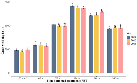 Effects of different FBT treatments on GY of spring wheat at the maturity stage across different years. Lowercase letters on the bars indicate comparative results at a significant level of 0.01 under different DFBTs (Tukey’s multiple comparisons test).
