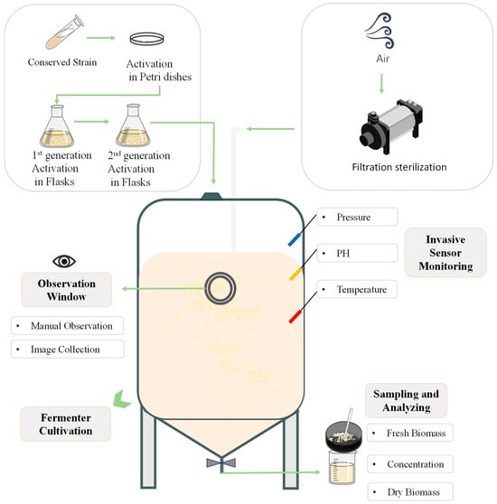 Liquid strain biomass determines both the quantity and quality of spawn used in the cultivation of edible fungi. Given that a liquid strain is cultivated in a nutrient-rich liquid medium, maintaining sterile procedures is crucial. This underscores the pressing need for implementing in situ and non-invasive monitoring during fermentation, which can achieve real-time monitoring and reduce manual intervention. Soft sensors offer solutions to these challenges by establishing models based on easily measurable auxiliary variables to derive dominant variables that are harder to measure []. However, those auxiliary variables in liquid strains are typically one-dimensional physical and chemical parameters, such as temperature, pH, and tank pressure, which remain relatively stable throughout fermentation; thus, it is challenging to generalize precise biomass parameters. Consequently, a soft sensor method based on machine vision for in situ non-invasive estimation monitoring of biomass is proposed here. Machine vision or computer vision mostly focuses on enabling computers to interpret and understand two-dimensional image information, which makes it excellent for intelligent surveillance in various applications, such as industrial robotics [,], medical healthcare [], food safety [,], precision agriculture [], and so on [,].