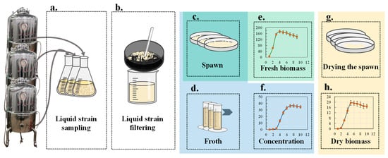 Liquid Strain Fermentation: The process is illustrated in Figure 1. The first step involved activating the conserved strain by inoculating it onto a PDA-enriched solid medium plate, which was incubated at 25 °C for approximately 20 days until the mycelium fully colonized the plate. Using a 0.5 mm diameter hole punch, 30 holes were created on the plate, and an inoculator was used to transfer the fungal pieces into liquid medium contained within shake flasks equipped with magnetic stirrers MS-01DUA (Crystal Technology & Industries, McKinney, TX, USA). The flasks were incubated at 25 °C with agitation at 150 rpm for 4 days. On the 4th day, the shake flasks were placed on a magnetic stirrer operating at 800 rpm for 30 min to disperse the mycelium pellets, after which cultivation was continued under the same conditions for another 4 days. At the end of this period, the activated liquid strain was prepared. The activated liquid strain was then inoculated into eight fermenters (GFSYTP-1000, Fusen Biotechnology Co., Ltd., Dalian, China), labeled Fer-A through Fer-H. Fermentation was initiated sequentially, with Fer-A beginning the liquid spawn fermentation cycle on day 1, Fer-B on day 2, Fer-C on day 3, and so forth, with each fermenter undergoing a 10-day fermentation cycle. Throughout the fermentation process, all procedures were conducted in a sterile clean room, adhering strictly to sterile protocols to prevent contamination by stray bacteria.