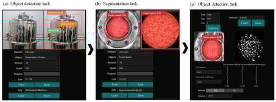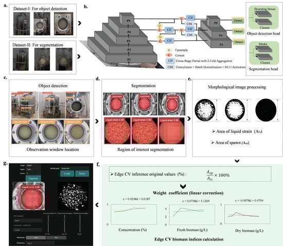 Based on this, the Edge CV model, as presented in Figure 3b, was developed to perform cascaded machine vision tasks culminating in biomass evaluation. The base model for computer vision in this study was yolov8. By customizing different detection heads, the model was configured to perform both object detection and segmentation tasks effectively. In the object detection task, bounding boxes and class labels were obtained, while in the segmentation task, segmentation masks and class labels were generated. These data then can be used for further biomass evaluation. The procedures of this process are shown in Figure 3c–e. First, object detection was achieved to classify and identify target objects while determining their position and size, represented by bounding boxes (Figure 3c). Second, instance segmentation was realized, which is critical for liquid spawn extraction, generating pixel-level class predictions (Figure 3d). This step extends object detection by identifying objects and defining their precise boundaries within the image. Third, morphological image processing was applied after segmentation to assess biomass indices (Figure 3e). Biomass concentration was calculated based on the volume or weight of spawn and froth. To enhance accuracy, the model considered both the pixel area ratio of fermentation spawn to froth and an additional weight coefficient to refine biomass index evaluations.