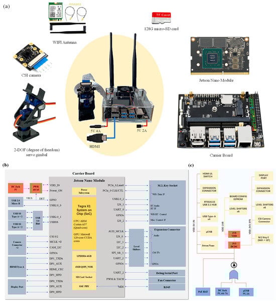 The development of the Edge CV platform involves both hardware and software development. The hardware framework consists of an edge computing unit, storage and operating system boot unit, image data sensing unit, and wireless communication unit, as illustrated in Figure 4. As presented in Figure 4a,c, the Edge CV platform is centered around the NVIDIA Jetson Nano 4 GB board (NVIDIA Corporation, Santa Clara, CA, USA), chosen for its compact design and efficient edge computing capabilities. Equipped with a 128-core Maxwell GPU (NVIDIA Corporation, Santa Clara, CA, USA) and a quad-core ARM Cortex-A57 CPU (ARM Holdings, Cambridge, UK), it supports parallel computing tasks essential for AI applications. The system features 4 GB LPDDR4 memory (NVIDIA Corporation, Santa Clara, CA, USA), a 128 GB microSD card (SanDisk, Milpitas, CA, USA) for storage and booting, and QSPI NOR Flash (Micron Technology, Boise, ID, USA). Wireless connectivity is facilitated through a network card and antennae, enabling remote control, while CSI cameras provide reliable data acquisition with compact form factors. The platform includes multiple I/O options such as four USB 3.0 ports, HDMI, Gigabit Ethernet, Camera Serial Interface (CSI), GPIO, I2C, SPI, and UART interfaces. Depending on application needs, peripherals like cameras and monitoring screens connect via Wi-Fi, USB, or headless modes. Powered by a 5 V DC input, the system is optimized for AI and computer vision tasks, balancing high performance with efficient power management. Figure 4c illustrates the interface connector power tree. The Jetson Nano is powered via 5 V DC, supplied through either a µUSB port or a DC Jack connector. The µUSB is commonly used for simpler setups, while the DC Jack provides a more robust option for industrial use. An internal DC-DC power regulator manages the distribution of power to the CPU, GPU, memory, and I/O interfaces. Additional power pins are available for peripherals, ensuring efficient power management across the system for optimal performance and stability.