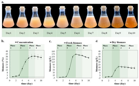 Manual analysis samples (a) and their dynamic growth curves, including concentration (b), fresh biomass (c), and dry biomass (d). Phase 1 denotes the adaptation phase, phase 2 denotes the rapid growth phase, phase 3 denotes the stable phase, and phase 4 denotes the aging phase.