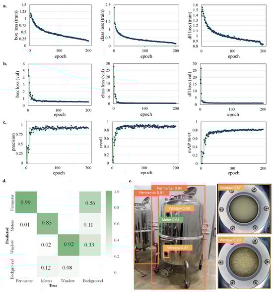 The running results of the machine vision’s task of object detection are presented in Figure 7. Object detection experiment running result metrics involve box (bounding box) loss, cls (class) loss, and dfl (detection and false localization) loss. Box loss focuses on refining the localization accuracy of bounding box predictions; cls loss focuses on the accuracy of class predictions, while dfl loss addresses the detection of false localization errors, helping the model to distinguish between true positive detections and false positives. Figure 3a,b show the fluctuations of loss and mAP throughout the training and validation process. These curves depict a declining trend for both box and class losses during training and validation iterations. These trends affirm that the training and validation processes effectively converge within 100 epochs. Conversely, the precision, recall, and mAP50:95 metrics steadily improve throughout the iterations, with precision reaching 97.7%, recall at 96.4%, and the best mAP50:95 score at 83.1%, further suggesting successful model convergence. Figure 7c,d depicts the run results of the Confusion Matrix, offering a visual representation of the model’s recognition accuracy and error distribution. The recognition accuracy for the fermenter, window, and meters were 0.99, 0.85, and 0.92, respectively. Finally, the model’s inference performance showcased its ability in our experiments (Figure 3e). The model accurately located the observation window, which can provide effective data on liquid strain for further processing. Furthermore, since the size of the observation window remains relatively constant, detecting the observation window enables the uniform sizing of the window across various machine vision screen areas, regardless of different distances and shapes.