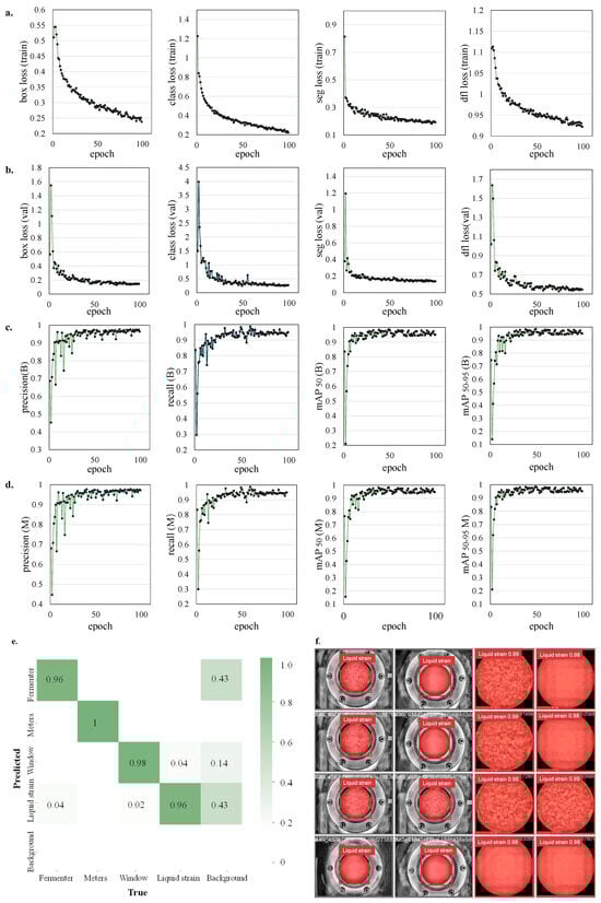 The running results of the machine vision’s task of segmentation are presented in Figure 8. For segmentation, the model is designed to output pixel-wise class predictions. Thus, in addition to the box loss and class (cls) loss, segmentation tasks include segmentation loss (seg loss), which measures the dissimilarity between the predicted segmentation mask and the ground-truth segmentation mask. Meanwhile, the evaluation metrics incorporate indices for both bounding box (B) and mask (M). Figure 4a,b illustrate the training and validation loss, gradually converging and stabilizing after approximately 100 epochs. The loss of cls, box, seg, and dfl demonstrate a rapid decline followed by slower convergence during training and validation iterations. Lower loss indicates that the model is better at detecting objects and segmenting them accurately. Conversely, the precision, recall, mAP50, and mAP50:95 metrics exhibit an increasing trend throughout iterations, both for bounding box (B) and mask (M), as shown in Figure 8c,d. Prediction (B) and recall (B) scored around 98.7% and 97.3%, respectively, while prediction (M) and recall (M) scored around 98.1% and 98.6%, respectively. The best iteration of mAP50 for the bounding box scored 97.7%, and masks scored 97.9%. Figure 8e depicts the results of the Confusion Matrix, which offers a visual representation of the model’s segmentation accuracy and error distribution. The segmentation accuracy for the fermenter, meters, window, and liquid strain (or spawn) was 0.96, 1, 0.98, and 0.96, respectively. Finally, the model’s prediction results, displayed in Figure 8f, demonstrated commendable segmentation performance. Therefore, the model successfully separates the region of liquid strain (or ROI: region of interest) in the observation window, achieving a confidence score accuracy above 90%. As the liquid strain zone must be within the observation window zone, determining the coordinates of the observation window can simplify data processing and improve data utilization efficiency.
