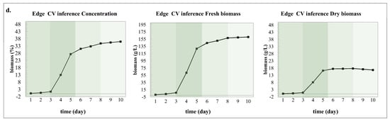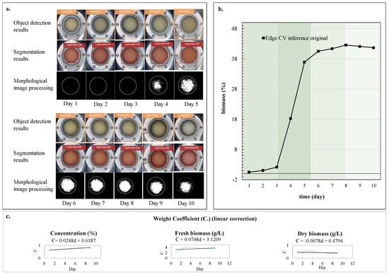 The experiment results of morphological image processing are shown in Figure 9. Edge CV inference was performed throughout the entire growth period of the liquid strain in the fermenter; Figure 9a summarizes its inference results for liquid strain biomass from day 1 to day 10. Figure 9b depicts the original calculation results of Edge CV based on pixel areas of liquid strain and froth, coming from object detection and segmentation results. Edge CV inference’s original index is based on light reflection differences and the area proportion of spawn and froth. Figure 9c shows the weight coefficient between the original results and routine results of biomass indices. Here, a linear coefficient is preferred over a constant coefficient, as it considers the fermentation stage, including the specific days and phases. Furthermore, both fresh and dried biomass are influenced by the volume and density of the spawn. Therefore, linear correction was also applied in calculating fresh biomass, as well as dry biomass. The distinct weight coefficients were obtained by matching those biomass indices from manual measurements. These weight coefficient values were calculated from manual testing results, based on area proportion values between real tested concentration, fresh biomass, and dry biomass. Figure 9d deficits the processed results of routine biomass indices for Edge CV inference. It was obvious that concentration, compared with fresh and dried biomass, is the most closely aligned with the original morphological results, as both are based on the size of mycelium spawn. Nevertheless, all evaluation results of biomass indices show a consistent relationship with the manual lab analysis results.