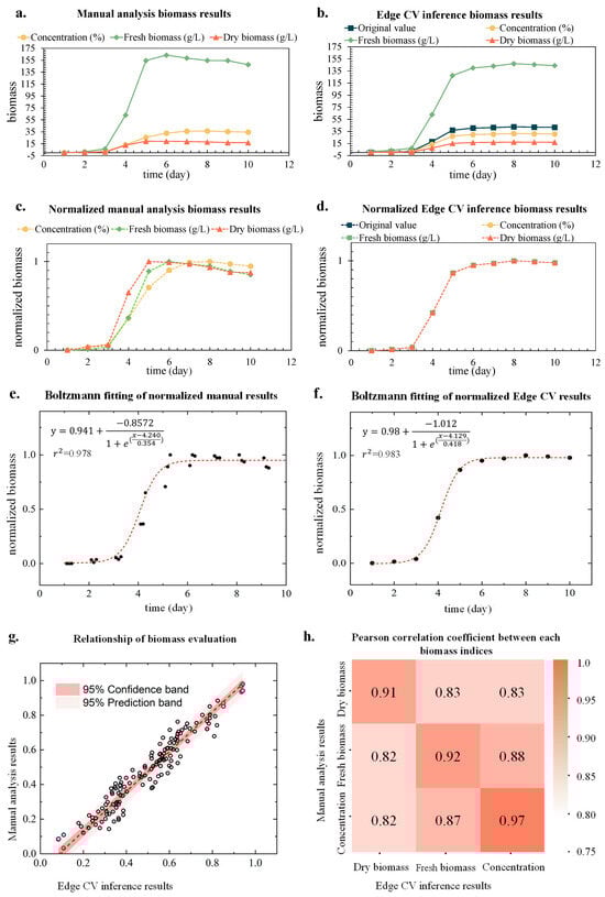 From Figure 10a,b, it is evident that all biomass indices, including concentration, fresh biomass, and dry biomass, are close in both values and growth trends. Additionally, the one-factor analysis of variance F value decreased from 0.39, 0.58, and 4.75 to 0.10, 0.12, and 0.09, respectively, after applying linear correction coefficients. Since the results of different biomass indices, such as concentration, fresh biomass, and dry biomass, were varied in y-value, normalization was conducted to scale these values between 0 and 1. The normalized results are presented in Figure 10c,d, from which we can see that these biomass results are in the same trend and their values are similar. Thus, in Figure 10d, it is shown that the values of the biomass indices—dry biomass, fresh biomass, and concentration—obtained through Edge CV inference are closely overlapped. This outcome aligns with expectations, as Edge CV results exhibit strong consistency between the three biomass indices. Therefore, Boltzmann fitting was conducted to analyze these trends; as presented in Figure 10e,f, the growth curves of biomass abide by the Boltzmann function with r2 of 0.978 and 0.983, respectively. Furthermore, Figure 10g,h show the correlations between Edge CV inference and manual measuring observed, with an r2 of 0.963 and RMSE 0.027 for normalized biomass indices. Meanwhile, the Pearson correlation coefficient analysis of the two sets of curves yields a value of 0.91–0.97, indicating a strong correlation and consistent change trend between different biomass indices from both manual analysis and Edge CV inference results, confirming their consistency.