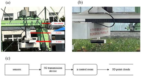 Diagram of the scanning process in the field: (a) a smart phenotyping platform; (b) a sidebar camera; (c) a data flow diagram.