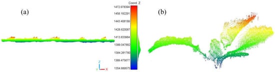 Pass-through filtering effect diagram: (a) the original point cloud image of rapeseed plot, (b) the point cloud image of rapeseed after pass-through.
