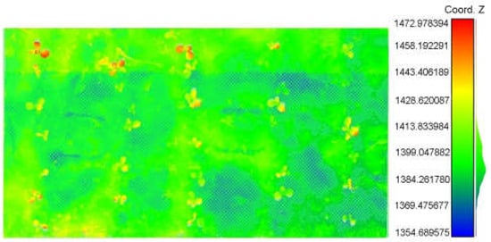 In this experiment, pass-through filtering was used to filter the noise of the ground point cloud. The principle of pass-through filtering is to first specify a dimension and set a threshold range. Then, iterate through each point in the point cloud and determine if the value of that point in the specified dimension is within the threshold. Points with values outside the threshold range are directly filtered out, and the remaining points after the iteration are considered the filtered point cloud. Since the coloring of the point cloud was performed based on elevation along the z-axis, the elevation values were used to determine the threshold range for denoising during pass-through filtering. The soil noise scanned in each plot was different, so the threshold range had to be selected accordingly.