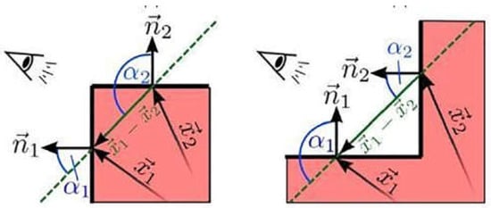 Figure 4 shows that when α1 < α2, the two supervoxels are connected convexly; otherwise, they are connected concavely. In the process of using the algorithm, Equations (6) and (7) were used for the CC criterion to reduce misjudgments of concave–convex relationships.