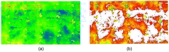 Taking the denoising effect of the first plot of rapeseed in Huyou 039 as an example, the rapeseed point cloud was filtered using pass-through filtering based on the elevation values. The same steps were followed for the subsequent plots. Figure 5a shows the original rapeseed point cloud, where the red box highlights the target point cloud. When coloring the point cloud, the z-axis direction was colored from blue to green to red, with the z-coordinate of a randomly selected point from the fitted plane serving as one limit of the pass-through filtering threshold. The blue value was used as the other limit, and denoising was performed using this threshold. The filtered point cloud is shown in Figure 5b. The z-axis direction of the filtered point cloud was colored from red to green to blue. The blank areas in the image indicate that the low points of the ground point cloud have been filtered out. If filtering continues upwards, the rapeseed point cloud will also be filtered out. Therefore, the appearance of blank areas in the denoised point cloud image serves as the criterion for the end of pass-through filtering.