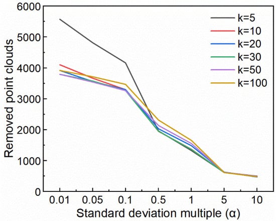 We found that when k is set to 50, the proportion of removed points to the total points before filtering was the highest (15.21%), as presented in Table 3. Therefore, this study sets the number of neighboring points to 50 and the standard deviation multiple to 0.1 for statistical filtering processing.