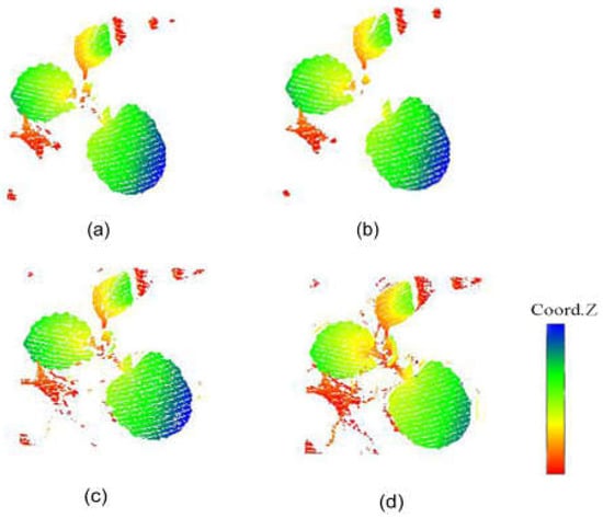 The denoising results from the point cloud image of rapeseed after statistical filtering: (a) when k = 5, α = 0.01; (b) when k = 100, α = 0.01; (c) when k = 5, α = 0.5; (d) when k = 5, α = 5.