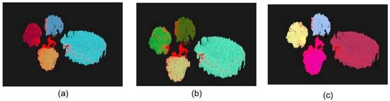 Due to the unique characteristics of rapeseed leaves at the bolting stage, using the same segmentation method as in the seedling stage resulted in uneven segmentation of overlapping leaves, as shown in Figure 10. Different colors in the segmentation results represent different segmented regions. Therefore, this study employed the LCCP algorithm for leaf segmentation of rapeseed plants at the bolting stage. The main parameters involved in this algorithm are voxel resolution, seed resolution, concavity tolerance threshold, and smoothness threshold. Through experimentation with different parameter values, it was found that the best segmentation results were achieved when the values of these four parameters were set to 2.0, 100.0, 100, and 10, respectively. The results of the LCCP algorithm are shown in Figure 10.