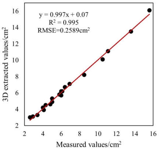 Figure 9 shows the accuracy assessment of the Huyou039 leaf area, comparing the manually measured leaf area with the leaf area extracted from the point cloud. The R2 and RMSE were 0.995 and 0.2589 cm2, respectively.