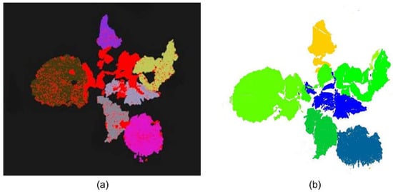 Segmentation results of rapeseed leaves at the bolting stage using (a) the region-growing algorithm and (b) the LCCP algorithm.