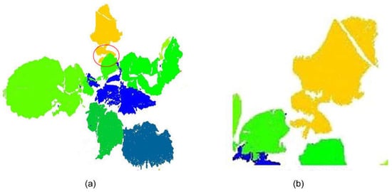 The point cloud of the leaf overlaps: (a) the red circle highlights the overlapping region, and (b) an enlarged view of this overlapping area.