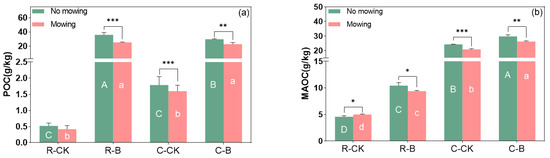 Effect of mowing and biochar on soil particulate organic carbon (POC) (a) and mineral-associated organic carbon (MAOC) (b) in different soil types (no biochar, CK; with biochar, B; red soil, R; and calcareous soil, C). Values represent mean ± SE (n = 4). Different uppercase letters indicate significant differences among treatments under no mowing, different lowercase letters indicate significant differences among treatments under mowing (p ≤ 0.05). Asterisk indicates significant differences between mowing and no mowing treatments (* p < 0.05; ** p < 0.01; and *** p < 0.001).
