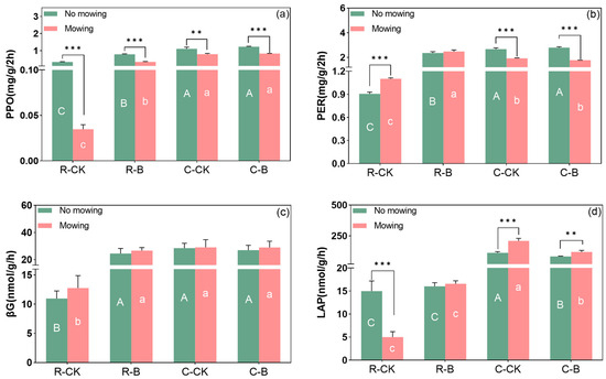Effect of mowing and biochar on polyphenol oxidase (PPO) (a), peroxidase (PER) (b), β-D-Glucosidase (βG) (c), and leucine aminopeptidase (LAP) (d) in different soil types (no biochar, CK; with biochar, B; red soil, R; and calcareous soil, C). Values represent mean ± SE (n = 4). Different uppercase letters indicate significant differences among treatments under no mowing, different lowercase letters indicate significant differences among treatments under mowing (p ≤ 0.05). Asterisk indicates significant differences between mowing and no mowing treatments (** p < 0.01; and *** p < 0.001).