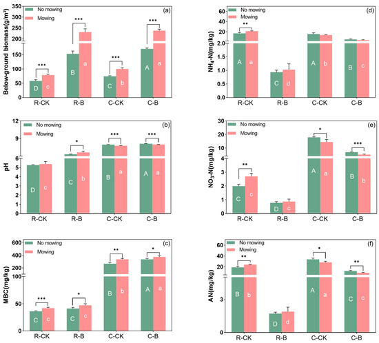 Effect of mowing and biochar on belowground biomass (a), pH (b), microbial biomass carbon (MBC) (c), ammonium nitrogen (NH4-N) (d), nitrate nitrogen (NO3-N) (e), and total available nitrogen (AN) (f) in different soil types (no biochar, CK; with biochar, B; red soil, R; and calcareous soil, C). Values represent mean ± SE (n = 4). Different uppercase letters indicate significant differences among treatments under no mowing, different lowercase letters indicate significant differences among treatments under mowing (p ≤ 0.05). Asterisk indicates significant differences between mowing and no mowing treatments (* p < 0.05; ** p < 0.01; and *** p < 0.001).