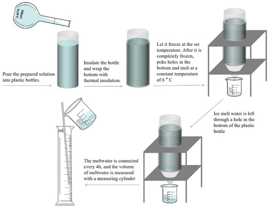 Fill the pre-configured saltwater into a numbered 600 mL plastic container, each filled with 500 mL of solution, with three replicates for each treatment. To mimic the natural freezing pattern from top to bottom in situ, the sides and bottom of the container were insulated with a 1 cm thick aluminum foil-backed foam insulation, allowing for the conduction of low temperatures from the top to the bottom. Following the experimental protocol, the containers were positioned within a cold storage facility, where the temperature was precisely controlled, as specified in Table 2. The freezing sequence initiated from the highest designated temperature, beginning with the −6 °C treatment. Upon the achievement of complete solidification, the temperature was systematically lowered to −9 °C for the subsequent treatment, and this procedure was repeated until all treatments were executed. The samples remained stored in the cold storage until the water samples for the −22 °C treatment were entirely frozen. Subsequently, all containers were uniformly transferred to a cold storage environment maintained at 6 °C. Below each container, a beaker was placed to collect the meltwater, with collections scheduled at 4 h intervals. This process yielded a total of 16 sets of meltwater samples, which were subsequently analyzed for salinity and volume. The detailed experimental setup is illustrated in Figure 1.