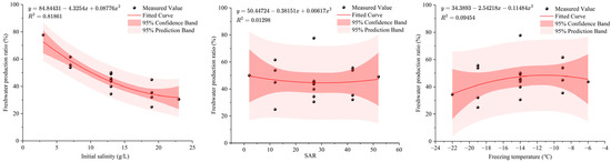 In Equation (5), is the freshwater production ratio (%), is the initial salinity of saline water (g/L), is the initial SAR of saline water, and is the freezing temperature (°C). All values are actual values.