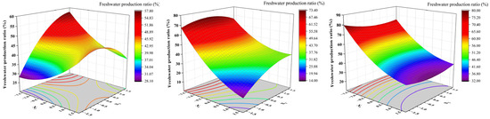 In Equation (4), is the freshwater production ratio (%), is the initial salinity of saline water, is the initial SAR of saline water, and is the freezing temperature. All values are coded value levels.