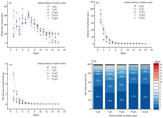 Changes in meltwater volume (a), salinity (b), amount of melted salt (c), and salt melt-out ratio (d) over time. Water samples were collected every 4 h, totaling 16 batches of melt water.