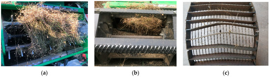 Obstruction of the working condition of the threshing drum during combined flax harvesting in hilly areas. (a) Clogging of full peg-tooth threshing drum; (b) difficulty in feeding full grain rod threshing drum; (c) damage and deformation of concave plate screen.