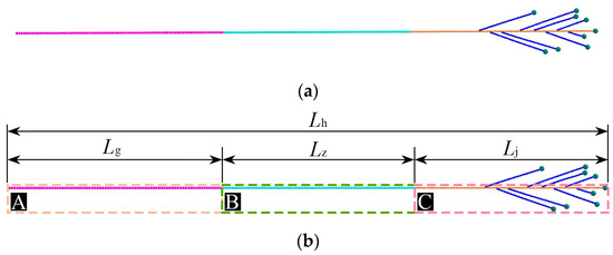 Discrete metamodeling of flax plants. (a) Whole plant shape; (b) characteristic parameters of each part. A is the flax capsule, B is the lateral branches of the flax plant, and C is the neck stem of the flax.