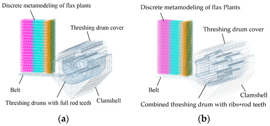 In this study, to address the problems of threshing device feeding difficulties, entangled drums, and low threshing efficiency in the process of combined harvesting of flax plants in hilly and mountainous areas, a discrete element flexible model of flax plants was established, and the performances and interactions of two threshing drum models (T1 and T2) were analyzed by using DEM-FEA co-simulation technology. Through the comparative study of the movement trajectory of the flax plant, mechanical stress distribution, and threshing effect, it verifies the advantages of the T2 model in improving threshing efficiency, reducing mechanical loss, and reducing entrainment loss, which provides a theoretical basis for the optimal design of threshing devices for flax combined harvesting. The main conclusions are as follows: