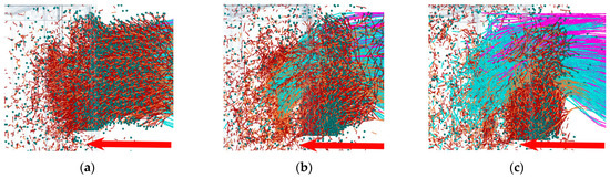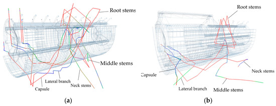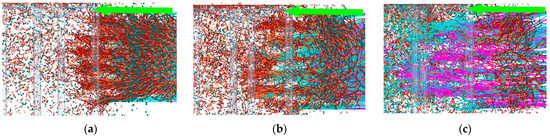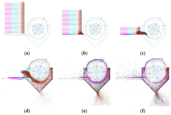 Figure 17a shows that in the T1 model, the discrete element simulation particle trajectory is complex, with the root, central, and neck stems of the flax plant performing spiral movements in the threshing chamber. These movements, influenced by the threshing drum and inner guide plate, result in the stems being discharged into the chamber, with the root stems having a significantly greater movement stroke than the central and neck stems. The lateral branches are broken and cyclically struck by the nail teeth, leading to their discharge after colliding with the concave plate. The flax capsules detach from the lateral branches upon impact and are discharged into the threshing chamber, though some capsules experience continuous impacts from the nail teeth. In Figure 17b, the T2 model shows a simpler particle trajectory. The root stems perform a spiral movement in the chamber and are discharged with the combined action of the threshing drum and guide plate. The central and neck stems follow incomplete spiral movements, with the central stems reaching the grass discharge port and the neck stems not, resulting in flax rejects. The flax capsules and lateral branches are discharged from the threshing chamber in the threshing section, forming two additional components of the flax rejects.