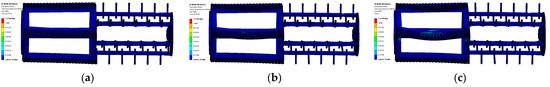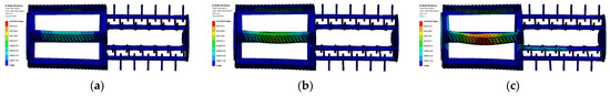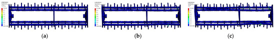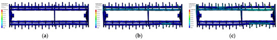 Stress program of the combined threshing drum in the T2 model. (a) 0.31 s; (b) 0.63 s; (c) 1 s.