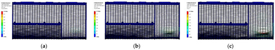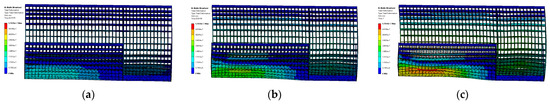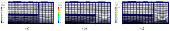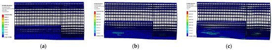 Stress program of the braided concave plate in the T1 model. (a) 0.26 s; (b) 0.57 s; (c) 1 s.