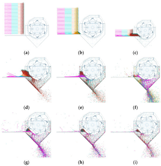 After the simulation calculation, the T1 model’s flax plant movement during the process was obtained at the post-processing interface. As shown in Figure 5, the flax plant moves onto the conveyor belt, where neighboring flax capsules and stems cross and become entangled. Upon contact with the full-rod tooth threshing drum, the flax capsule and side branches are struck and fall off by the nail teeth. The nail teeth cause a shunting effect, separating areas where the strike is incomplete and complete. In the incomplete strike region, the flax plant’s stems and capsules rupture inadequately, resulting in poor seed threshing. In the complete strike region, the rupture is more thorough, yielding better threshing. The flax plants in the incomplete strike area continue into the threshing gap, where the crossbar’s striking effect is weaker than the nail teeth. However, the crossbar facilitates smoother feeding, allowing the flax plants to enter the threshing gap more smoothly under continuous action from both the nail teeth and the crossbar.