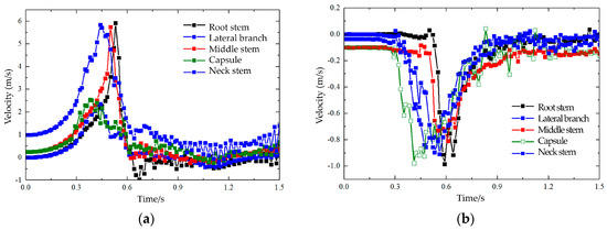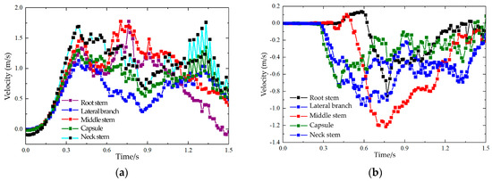 In the EDEM post-processing module in the T1 and T2 models of discrete metasimulation of the flax plant root stems, central stems, neck stems, lateral branches, capsules, and other particle groups were the object of data extraction. The extracted T1 and T2 models 1~1.5 s in the x-axis, z-axis average velocity of the particle groups, as shown in Figure 18 and Figure 19.
