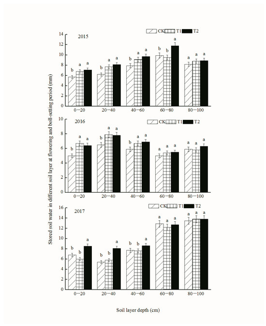 Stored soil water in different soil layers at flowering and boll-setting periods in 2015, 2016 and 2017. Different lowercase letters indicate significant differences between different treatments using LSD test at p < 0.05.