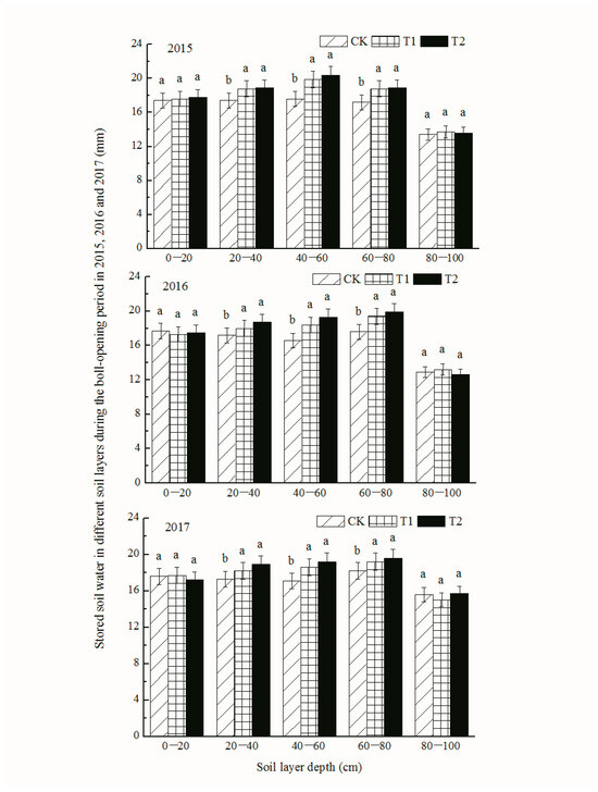 As much more rainfall occurred during the boll-opening period, there were no significant differences in stored soil water in the 0–20 cm tilth layer among the different treatments (Figure 4). However, in the three growth seasons, there was significantly more stored soil water in the 20–80 cm tilth layer under T1 (56.0 mm, 2017) and T2 (57.7 mm, 2017) than under CK (52.6 mm, 2017). There was more stored soil water in the 20–80 cm tilth layer under T2 (57.7 mm, 2017) than under T1 (56.0 mm, 2017), but there was no significant difference between T1 and T2. The results indicated that inversion with subsoiling had residual positive effects on stored soil water.