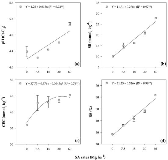 The application of SA significantly influenced the CEC (CEC = SB + H + Al), as indicated by a quadratic fit with a maximum point at a rate of 43.72 Mg ha−1 of SA (45.95 mmolc kg−1) (Figure 1c).