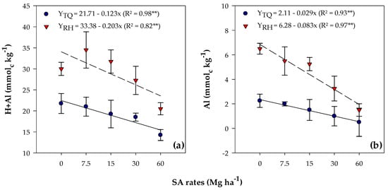Increasing rates of SA led to a linear decrease in potential acidity (H + Al) in both soils (Table 3). Values ranged from 21.75 to 14.25 mmolc kg−1 for TQ, while for RH, the range was 30.00 to 20.50 mmolc kg−1 (Figure 2a).