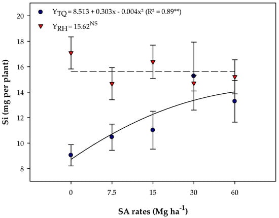 Silicon accumulation was influenced by SA rates in TQ soil (Figure 5), with a quadratic fit and a maximum point at a rate of 50 Mg ha−1 (16.01 mg of Si per plant) (Figure 5). However, there was no difference between SA rates for silicon accumulation in RH soil, and the average value was 15.62 mg of Si per plant (Figure 5).