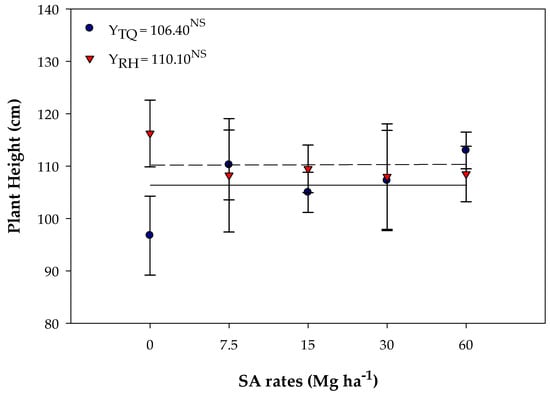 Soybean plant height (PH) in Typic Quartzipsamment (TQ) and Rhodic Hapludox (RH) soils in response to the residual effect of SA application. NS—Not significant. Bars stand for the St. Err. of the mean.