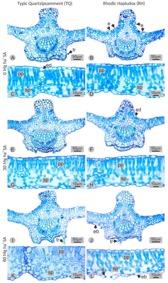 Cross-sections of soybean leaves cultivated in a Typic Quartzipsamment (TQ) and a Rhodic Hapludox (RH) soil as a function of SA rates (0, 30, and 60 Mg ha−1). (A,B,E,F,I,J) showing the central vein. (C,D,G,H,K,L) showing the leaf lamina. e = stomata, eb = abaxial epidermis, ed = adaxial epidermis, pp = palisade parenchyma, sp = spongy parenchyma, tr = trichome.