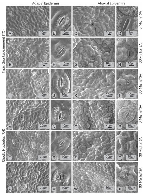 Scanning electron microscopy of the leaf surface of soybean cultivated in a Typic Quartzipsamment (TQ) and a Rhodic Hapludox (RH) soil as a function of the application of rates (0; 30 and 60 Mg ha−1) of silicate mineral fertilizer (SMF), as indicated laterally to the images. (A,E,I,M,Q,U), wide view of the adaxial epidermis; (B,F,J,N,R,V) showing detail of stomata of the adaxial epidermis. (C,G,K,O,S,W) wide view of the abaxial epidermis; (D,H,L,P,T,X) showing detail of stomata of the abaxial epidermis.