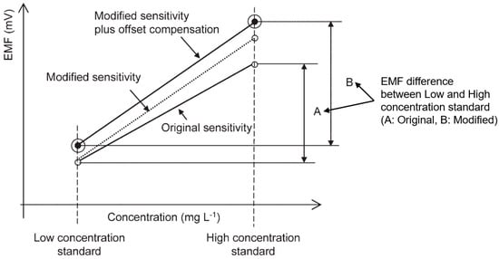 According to previous research, the limit of detection (LOD) and limit of quantification (LOQ) for the NO3 and K electrodes used in this study were derived from the regression equations []. The LOD for both NO3 and K electrodes is approximately 1 mg/L, and the LOQ is also around 1 mg/L. The sensitivities of the electrodes, represented by the slope of the regression equations, are 44.4 mV/decade for NO3 and 60.5 mV/decade for K, demonstrating their reliable performance in detecting ion concentrations. For the Ca2+ electrode, a commercial electrode with a sensitivity of 29 mV/decade was used. The LOD and LOQ for the Ca electrode are approximately 0.02 mg/L, ensuring accurate detection and quantification even at low concentrations. It was noted that the sensitivity and drift due to ion accumulation on the surface of the ion-selective PVC membrane can degrade the measurement when using ion-selective electrodes. Furthermore, when configuring an electrode array to measure various ions simultaneously, an error between the measurements can arise due to the differences between the sensors. Based on a previous study [] that demonstrated the effectiveness of a two-point normalization method in standardizing the responses between electrodes in a multi-electrode setup and minimizing the effects of drift, this study also adopted a two-point normalization approach for sensor drift compensation (Figure 3) [].