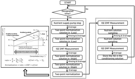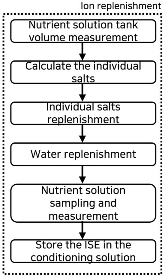 Using low- and high-concentration two-point normalization solutions, the ISEs were calibrated to enable the measurement of ion concentrations after sampling the nutrient solution from the tank. The sampling of the two-point-normalization solution and the nutrient solutions was carried out using controlling pumps (AQA DC Motor, Cinyar, Shanghai, China) connected to a relay module attached to the GPIO of a Raspberry Pi board. The ion monitoring system designed in this study allowed for both the calibration and measurement of individual ion concentrations within the same measurement chamber, which could lead to potential interference and contamination by the previously contained solutions. Therefore, the solution was initially injected to rinse the chamber, minimizing the interference during cleaning; then, it was injected again for measurement. The sampled solution in the chamber was allowed to stabilize for a minute before collecting signals through SPI communication with an ADC converter connected to the Raspberry Pi. The operation algorithm based on this setup is illustrated in Figure 4.