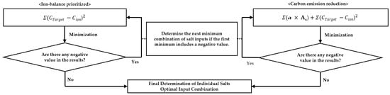To determine the optimal amounts of individual salts required for replenishment based on the concentration results obtained from prior ion monitoring, an effective algorithm is essential. This study developed two algorithms, an ion balance-prioritized algorithm and a carbon emission reduction algorithm, to address the practical limitations of existing methods. These algorithms were designed to overcome the limitations of the Simplex-based algorithm used in previous researches, which often calculated infeasible negative solutions [,]. In cases where negative solutions are encountered during the calculation of the individual salt combination process, the algorithm restarts from the initial step to identify a new feasible combination of salt inputs. To achieve this, the algorithm employs the minimize function from the Python library to derive the optimal combination of individual salts to minimize the sum of squared errors between the post-replenishment ion concentrations and the target concentrations. If any infeasible solutions appear, the process is repeated until a feasible solution is identified (Figure 5).